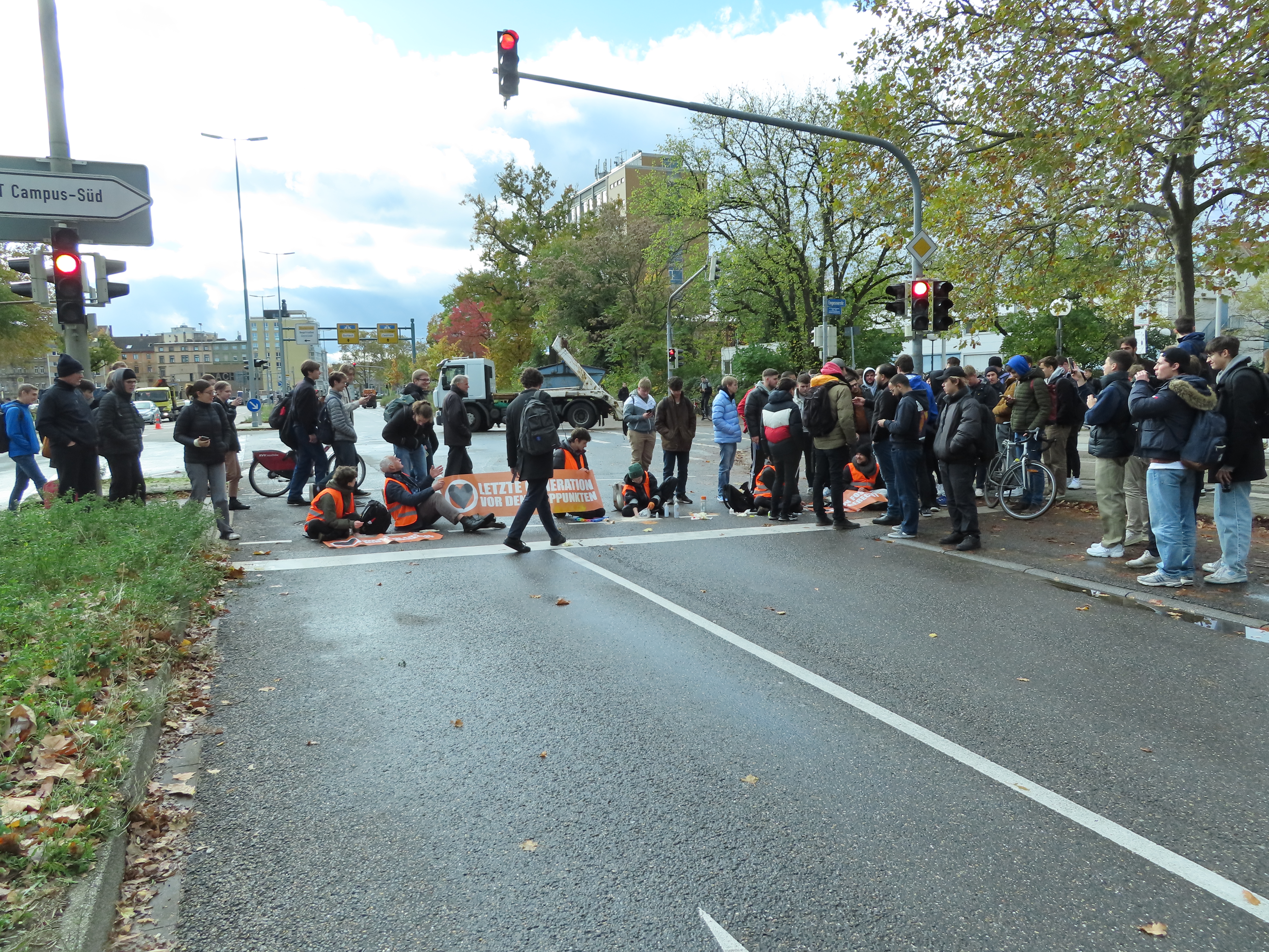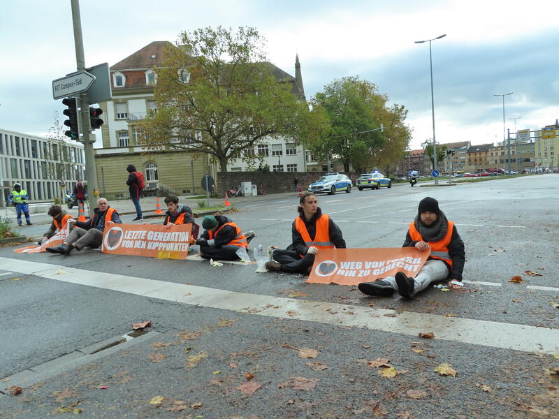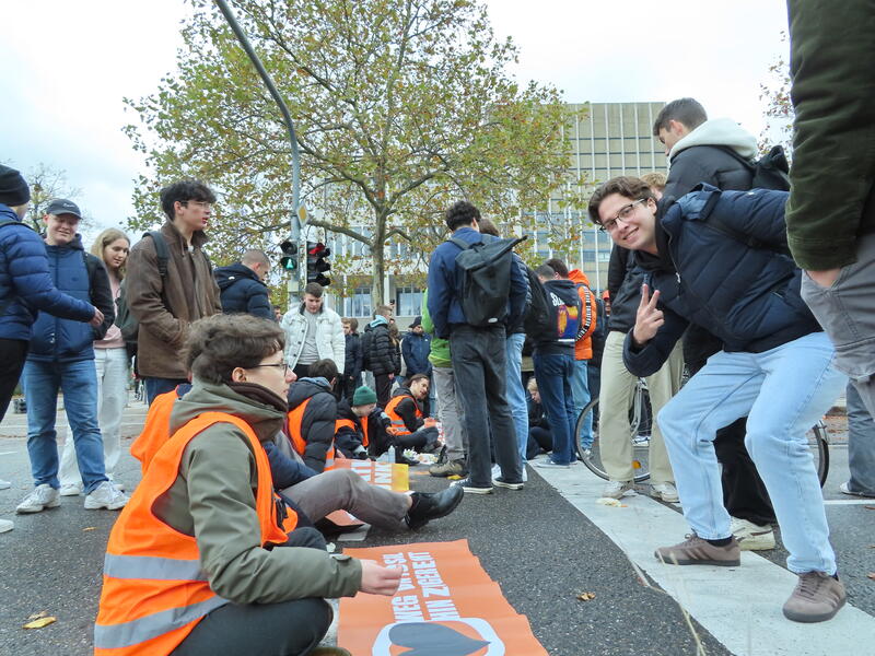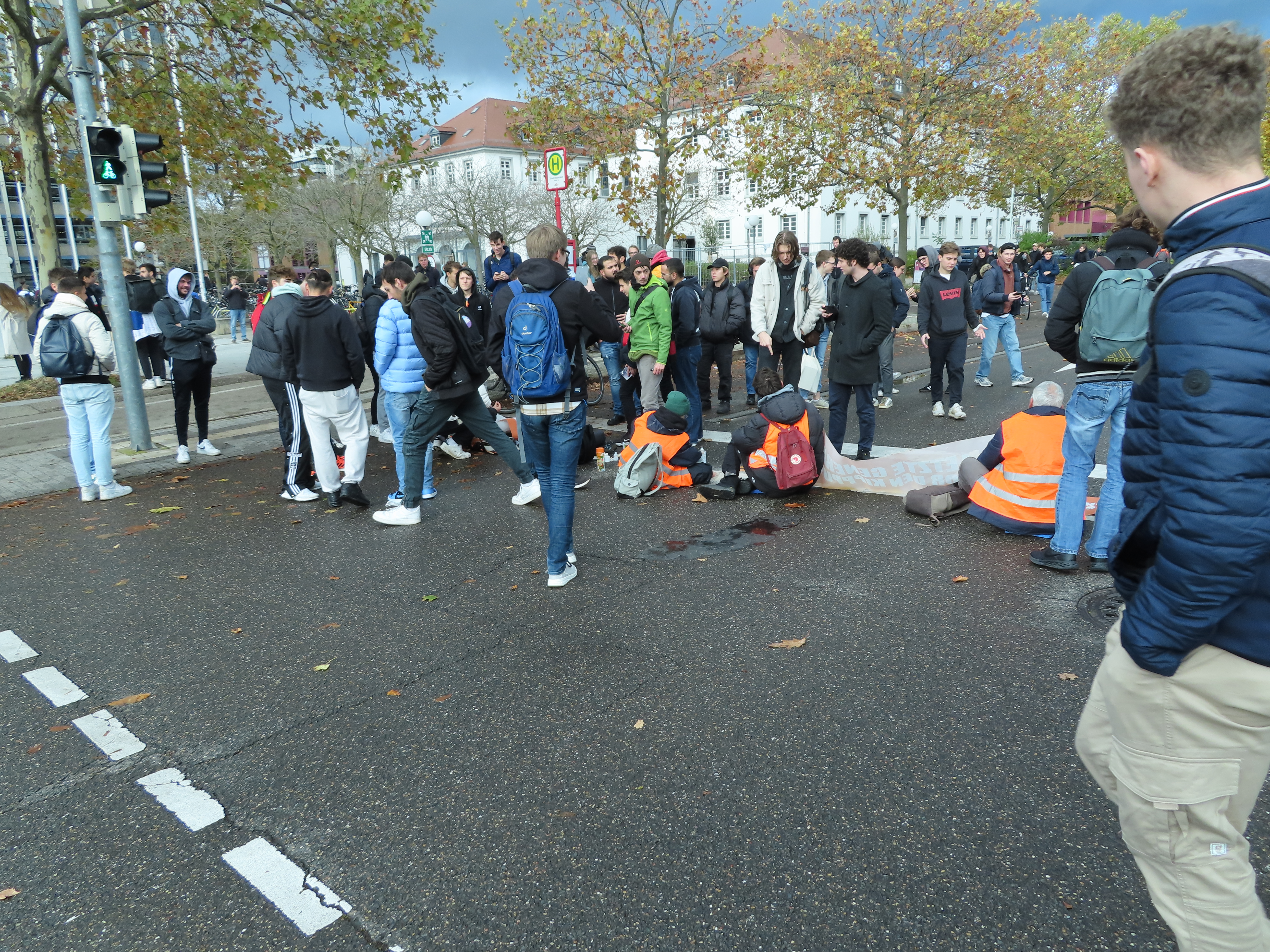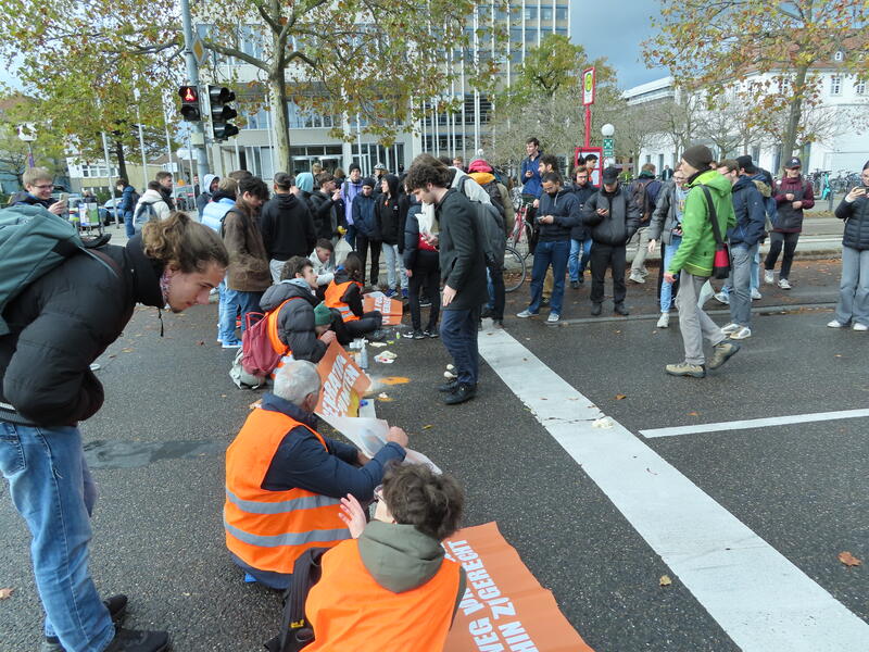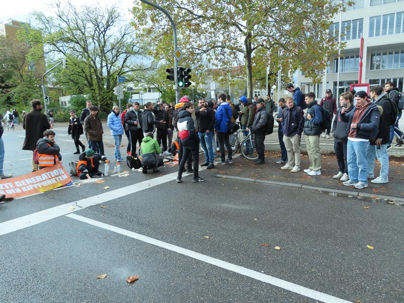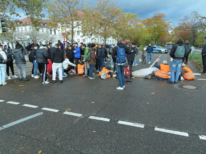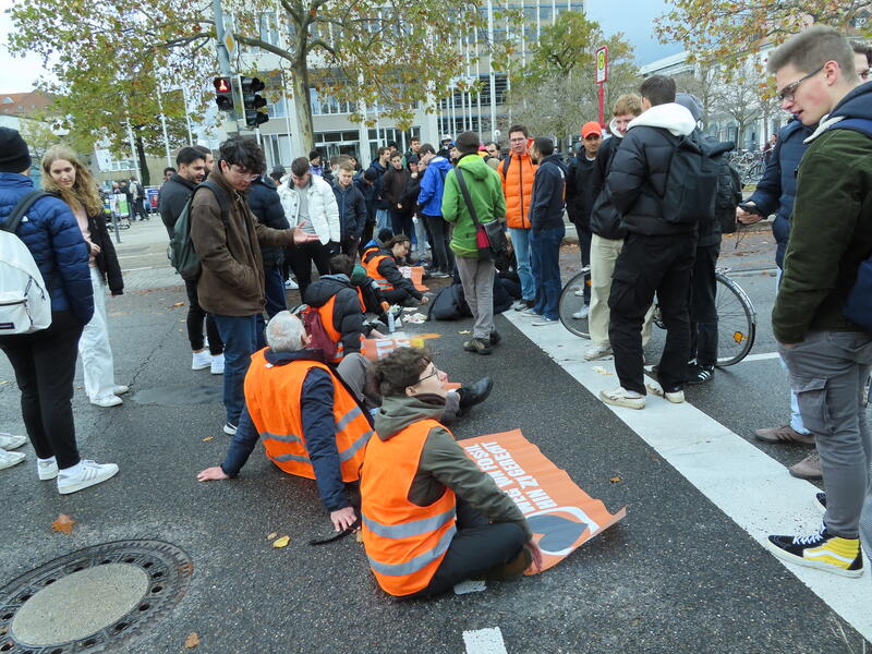Straßenblockade auf dem Karlsruher Adenauerring, Höhe Studentenhaus, am 2023-11-10