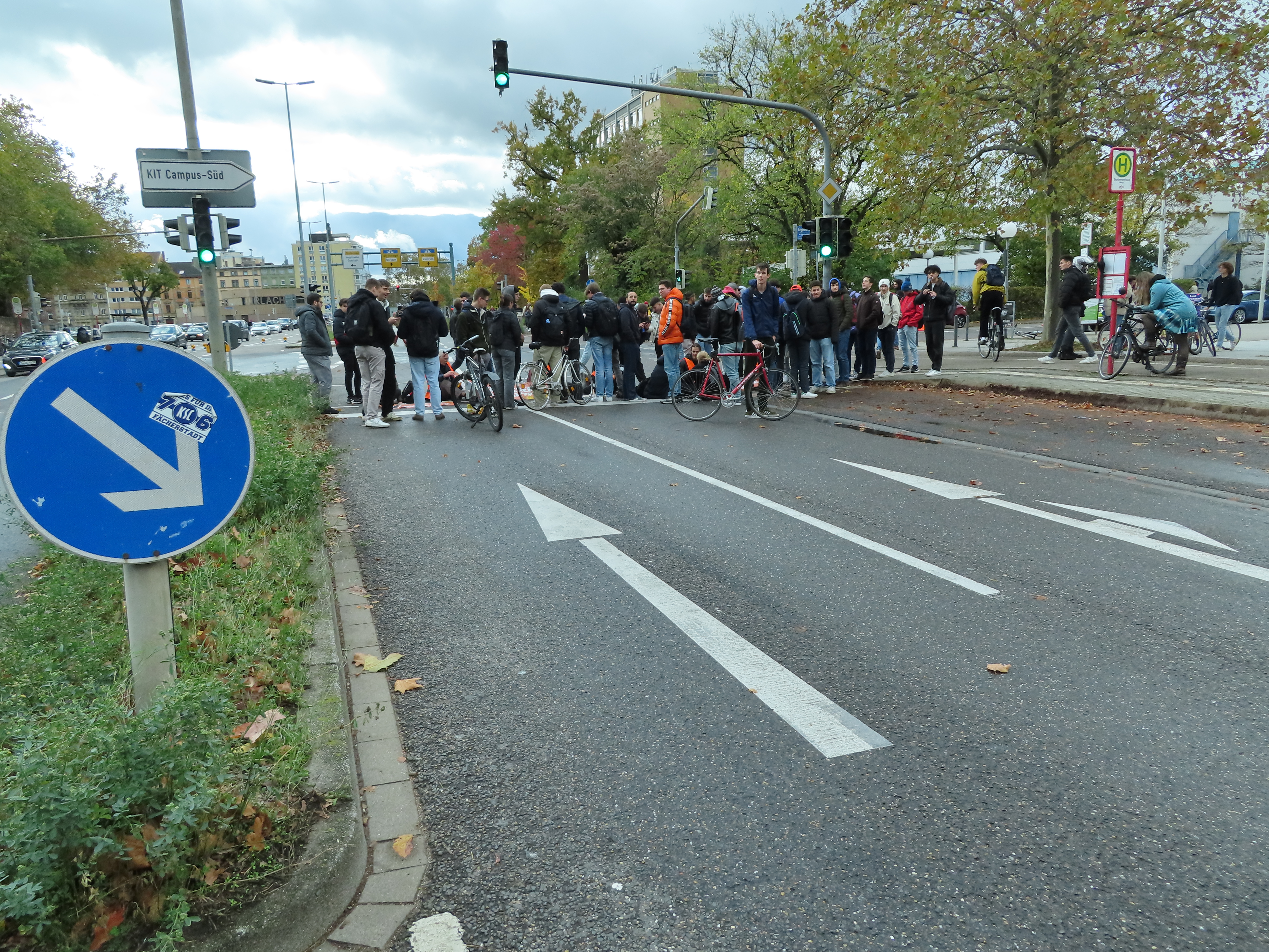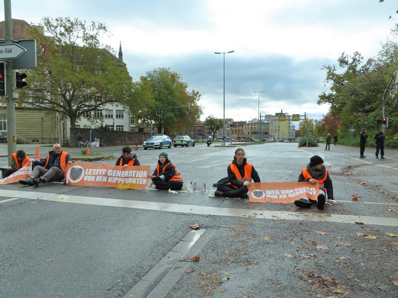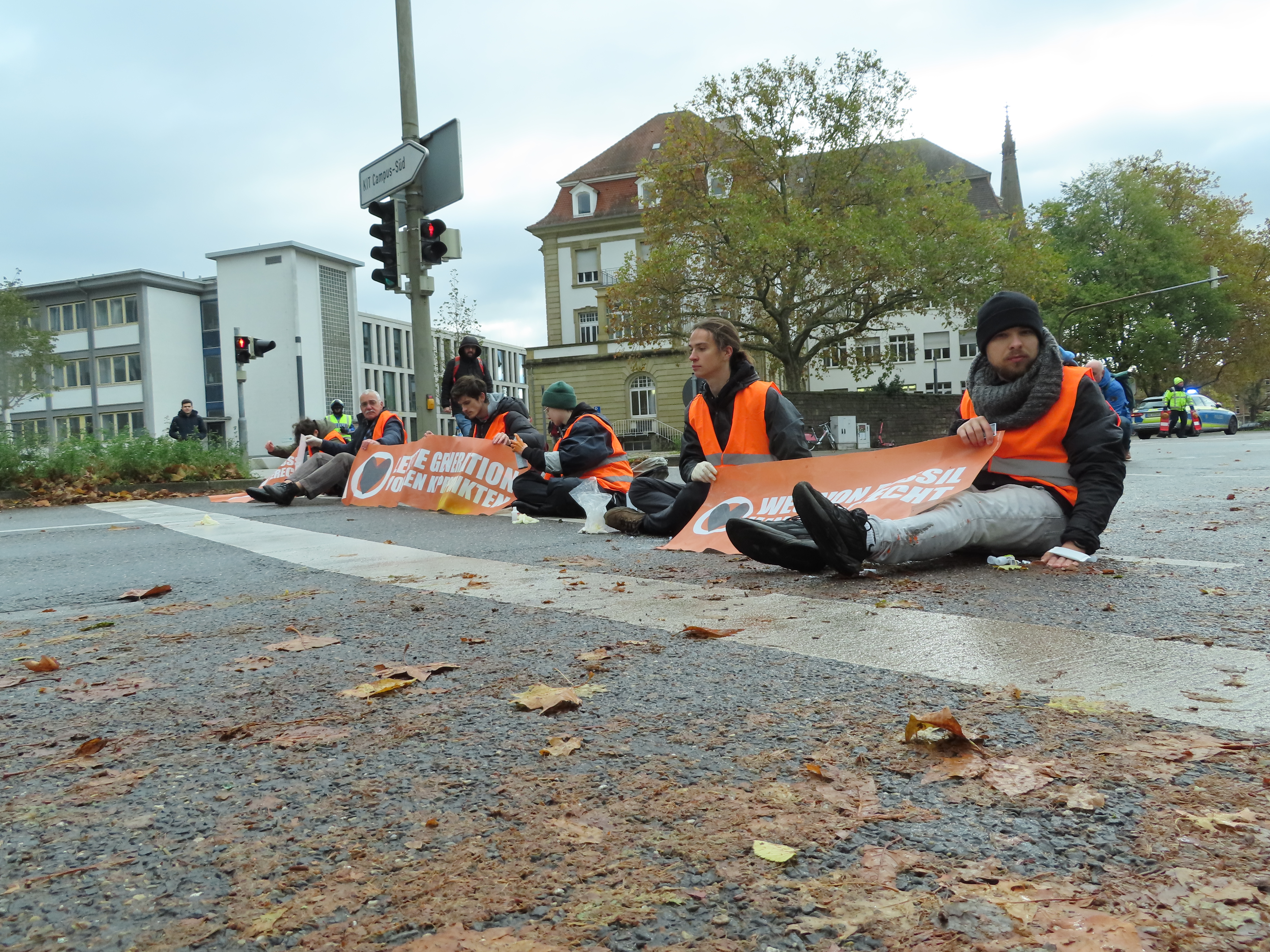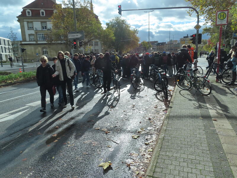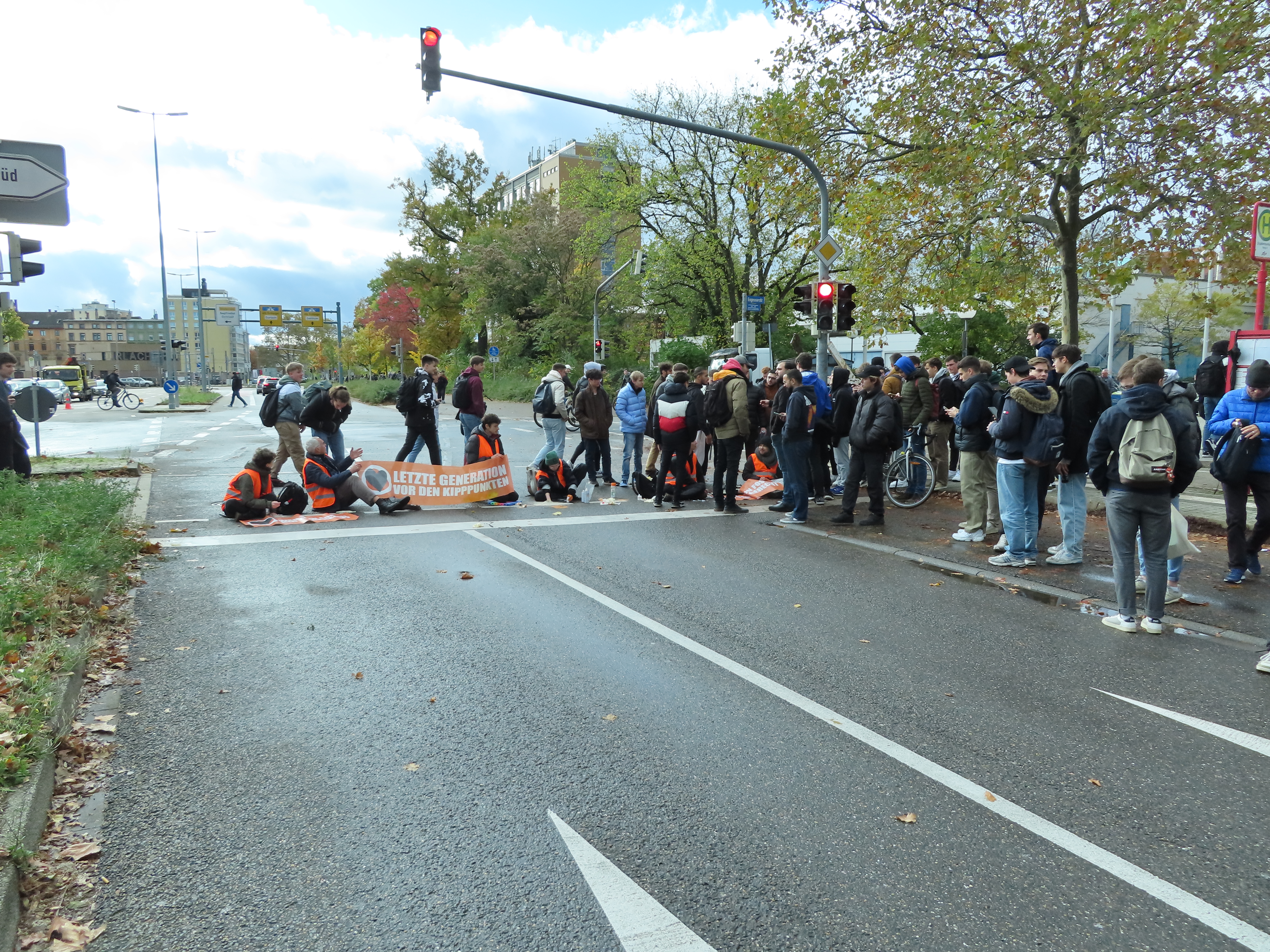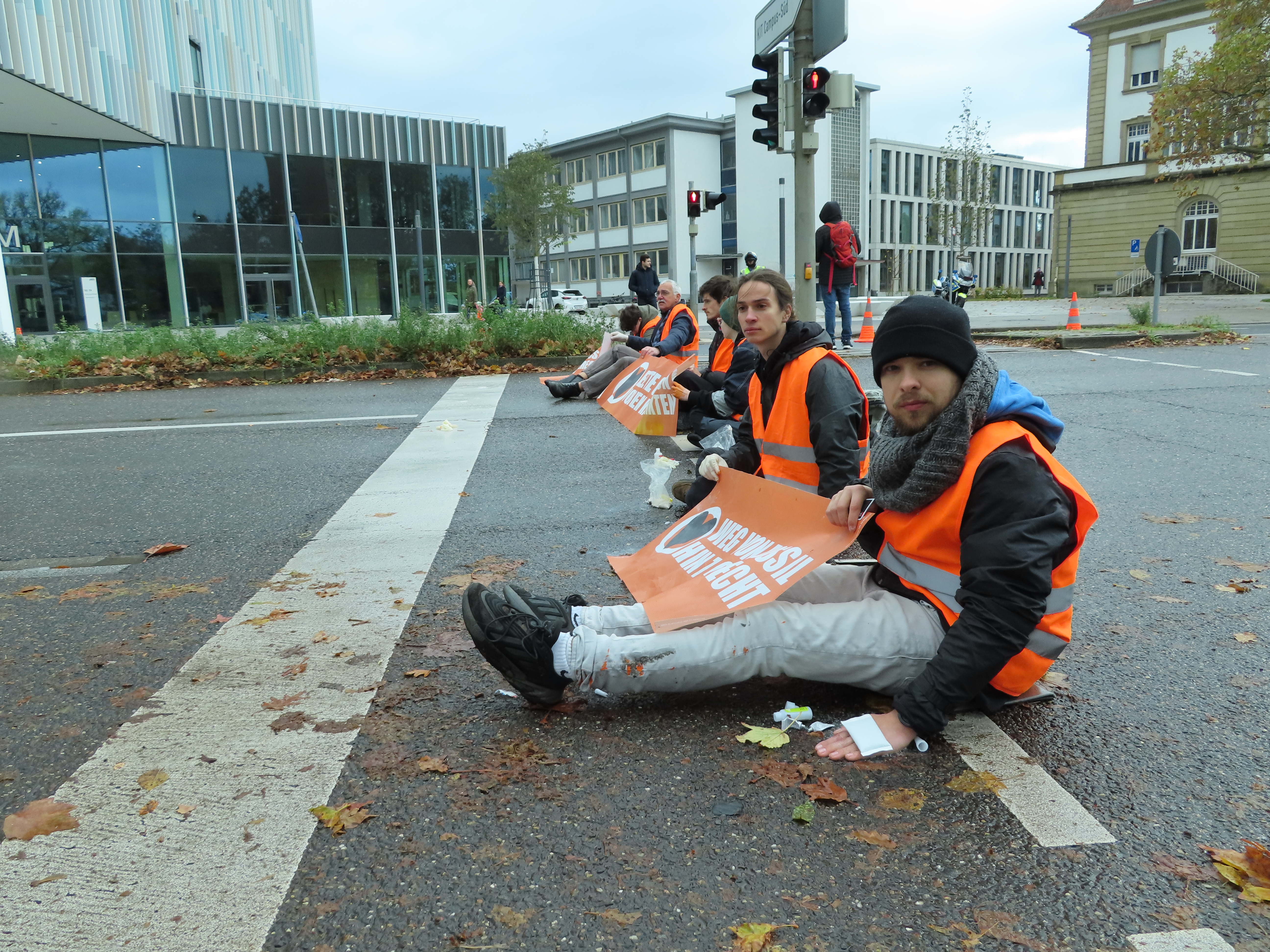Straßenblockade auf dem Karlsruher Adenauerring, Höhe Studentenhaus, am 2023-11-10