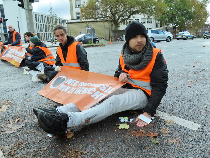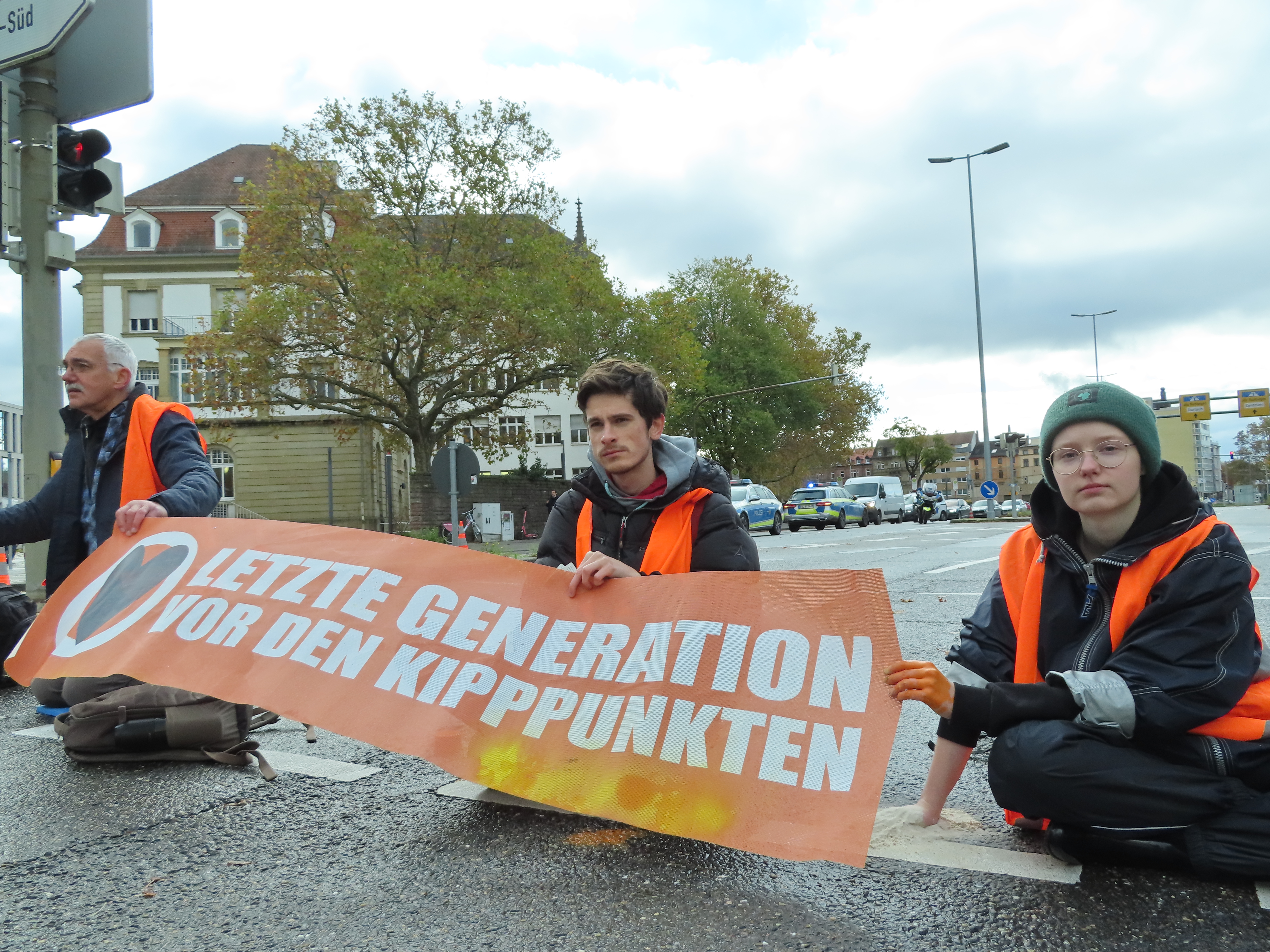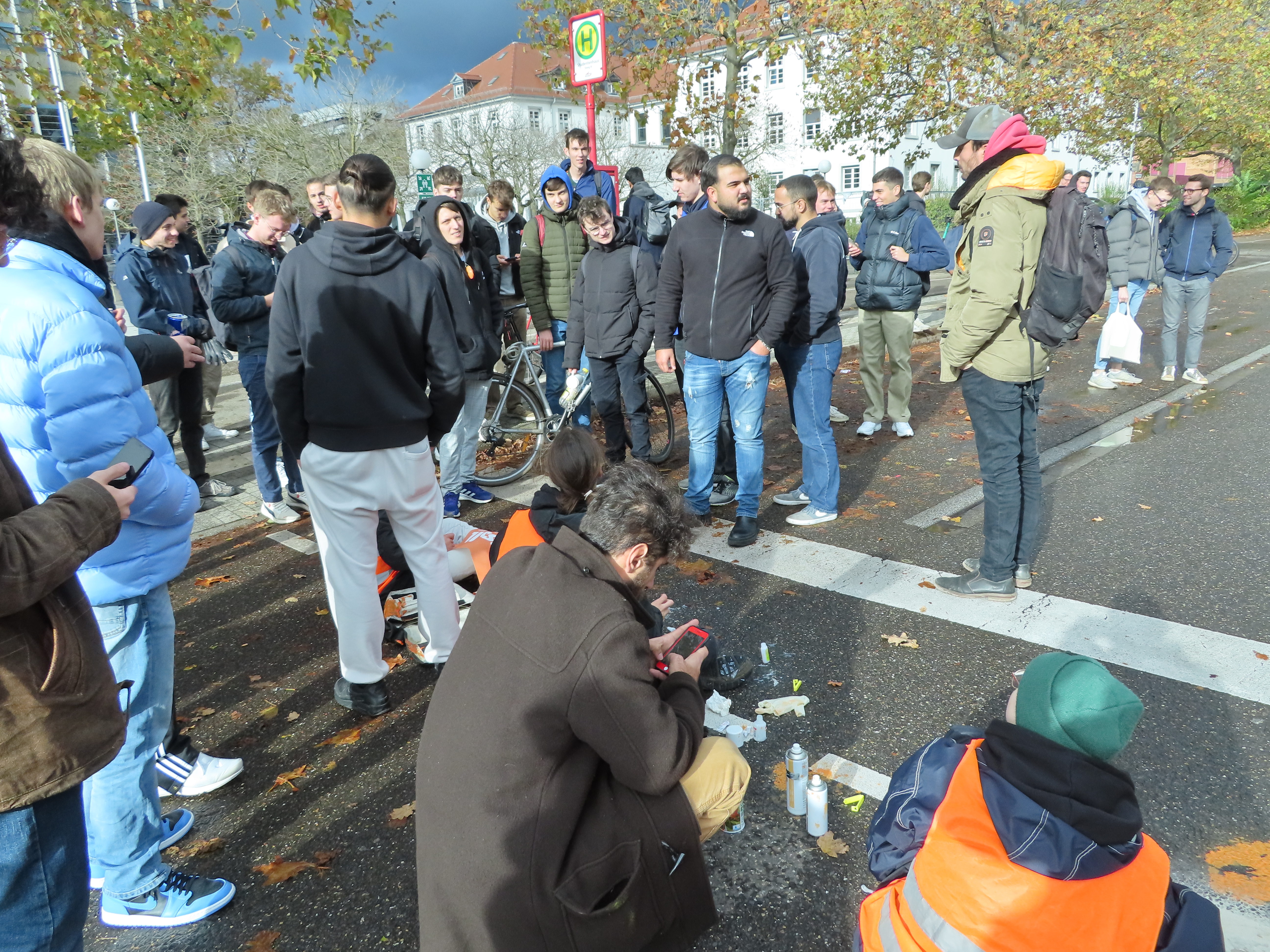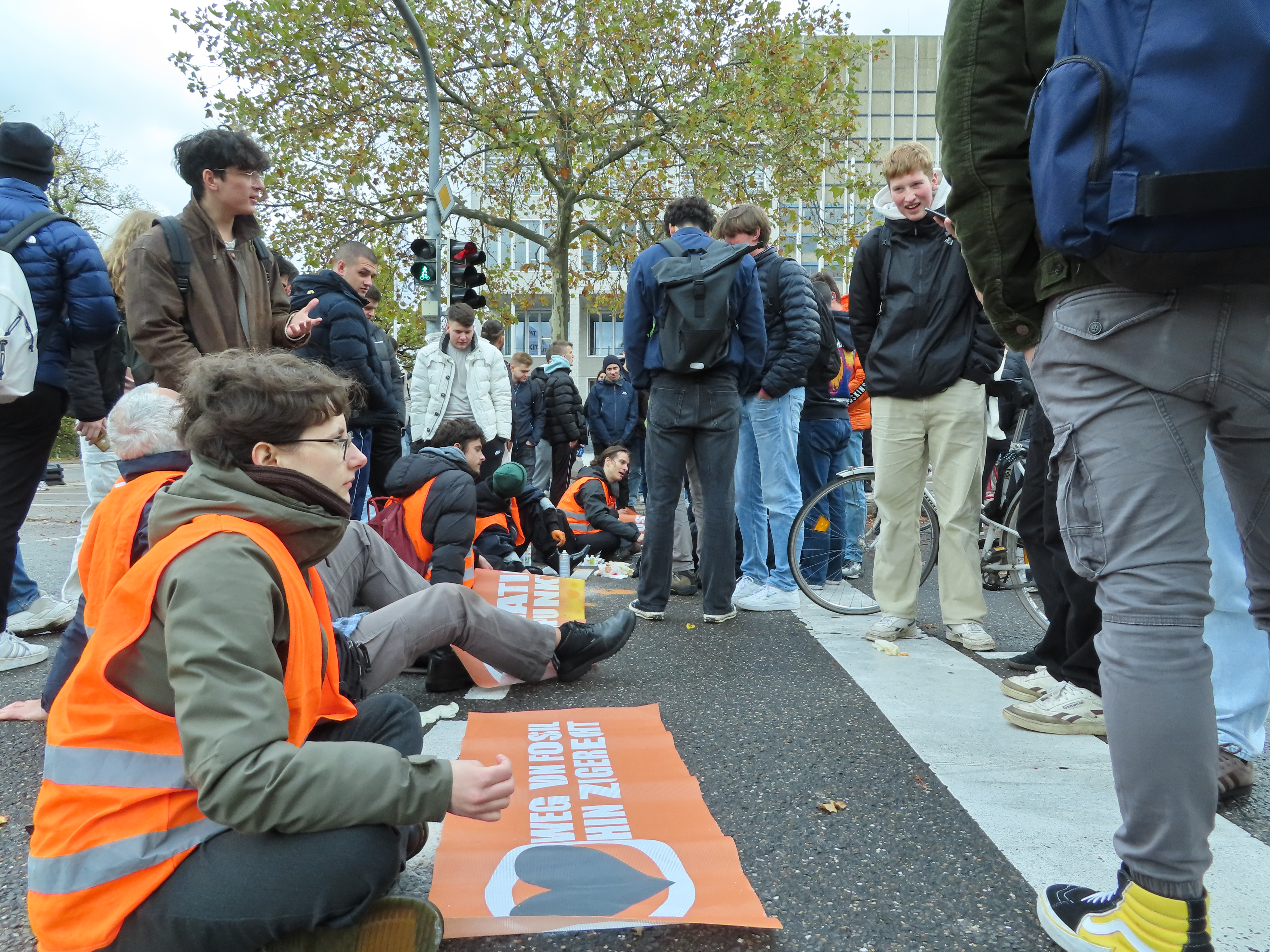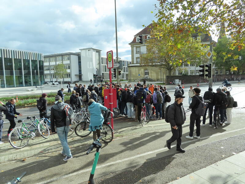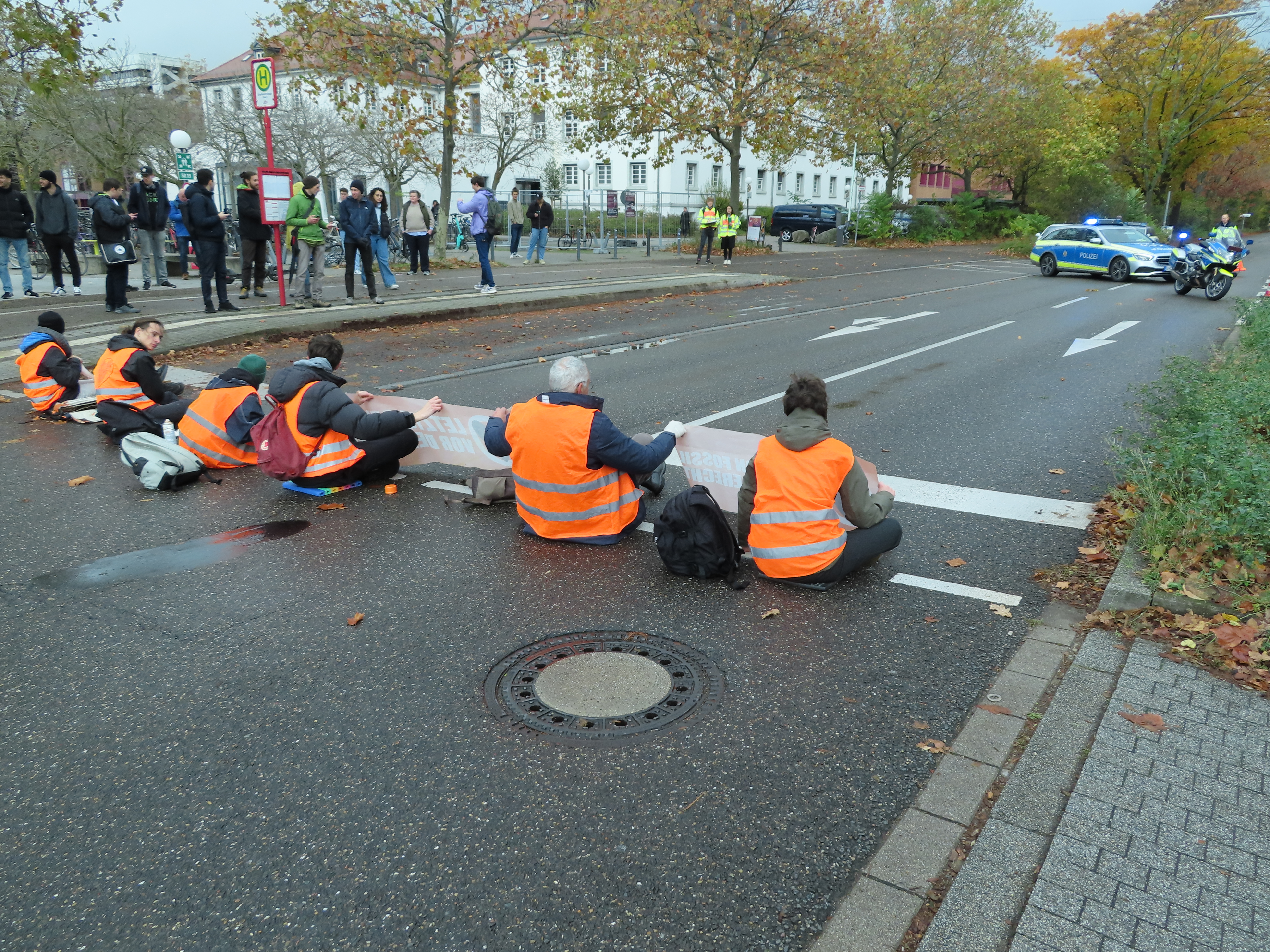 Straßenblockade auf dem Karlsruher Adenauerring, Höhe Studentenhaus, am 2023-11-10