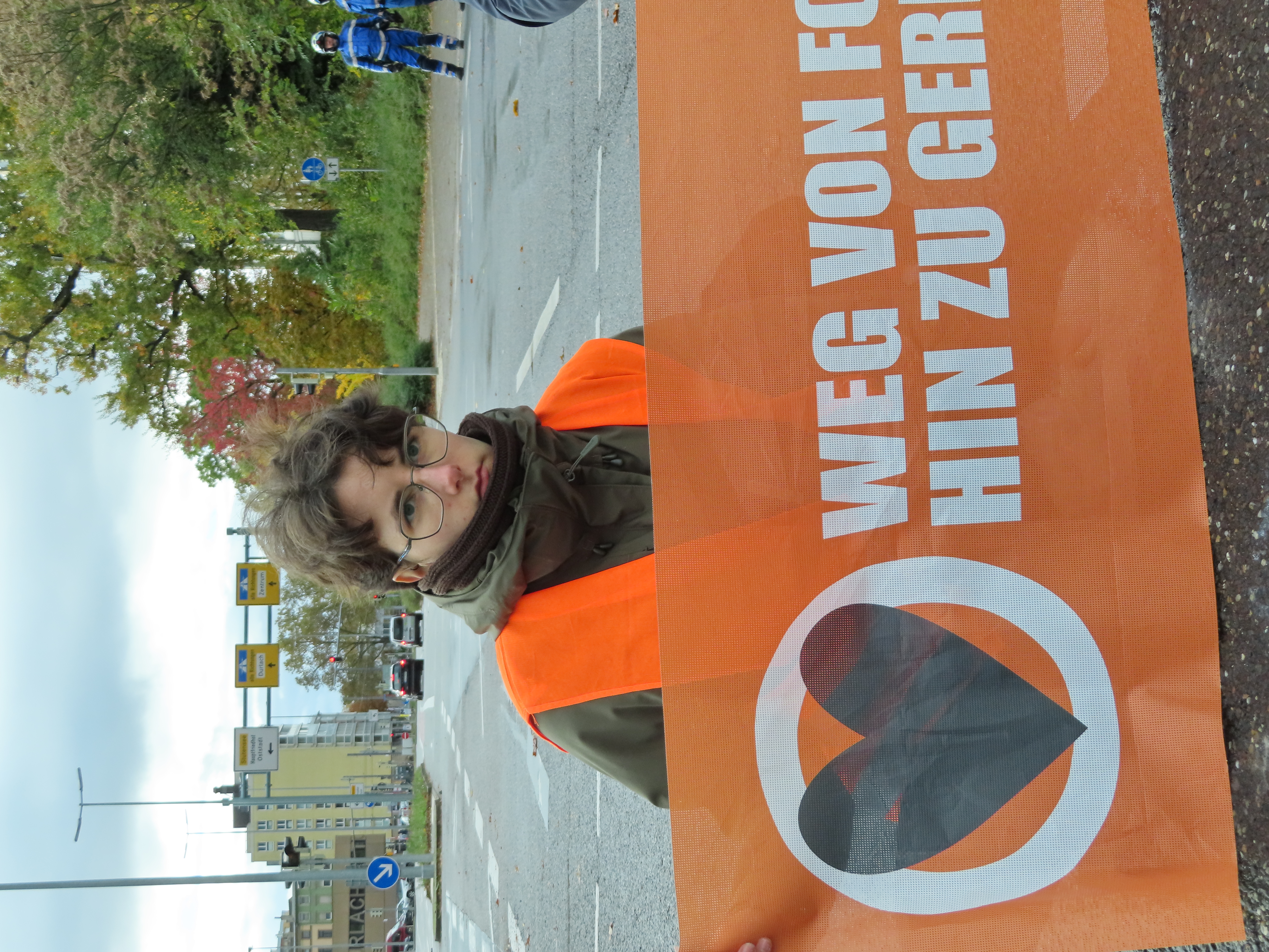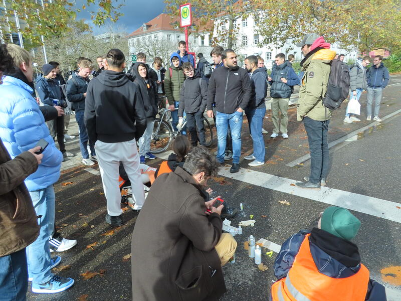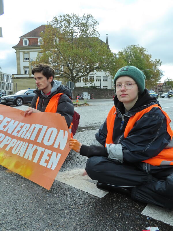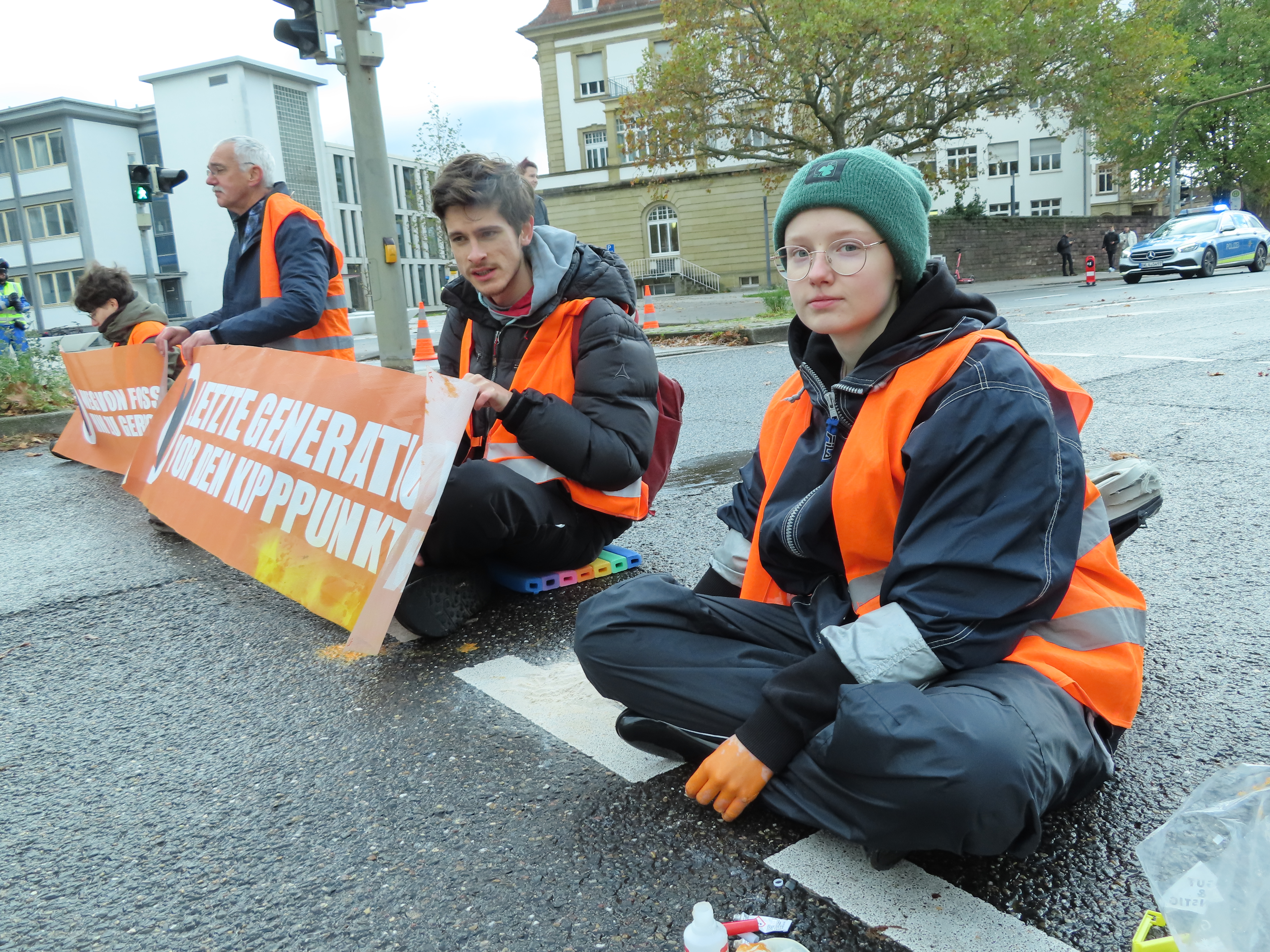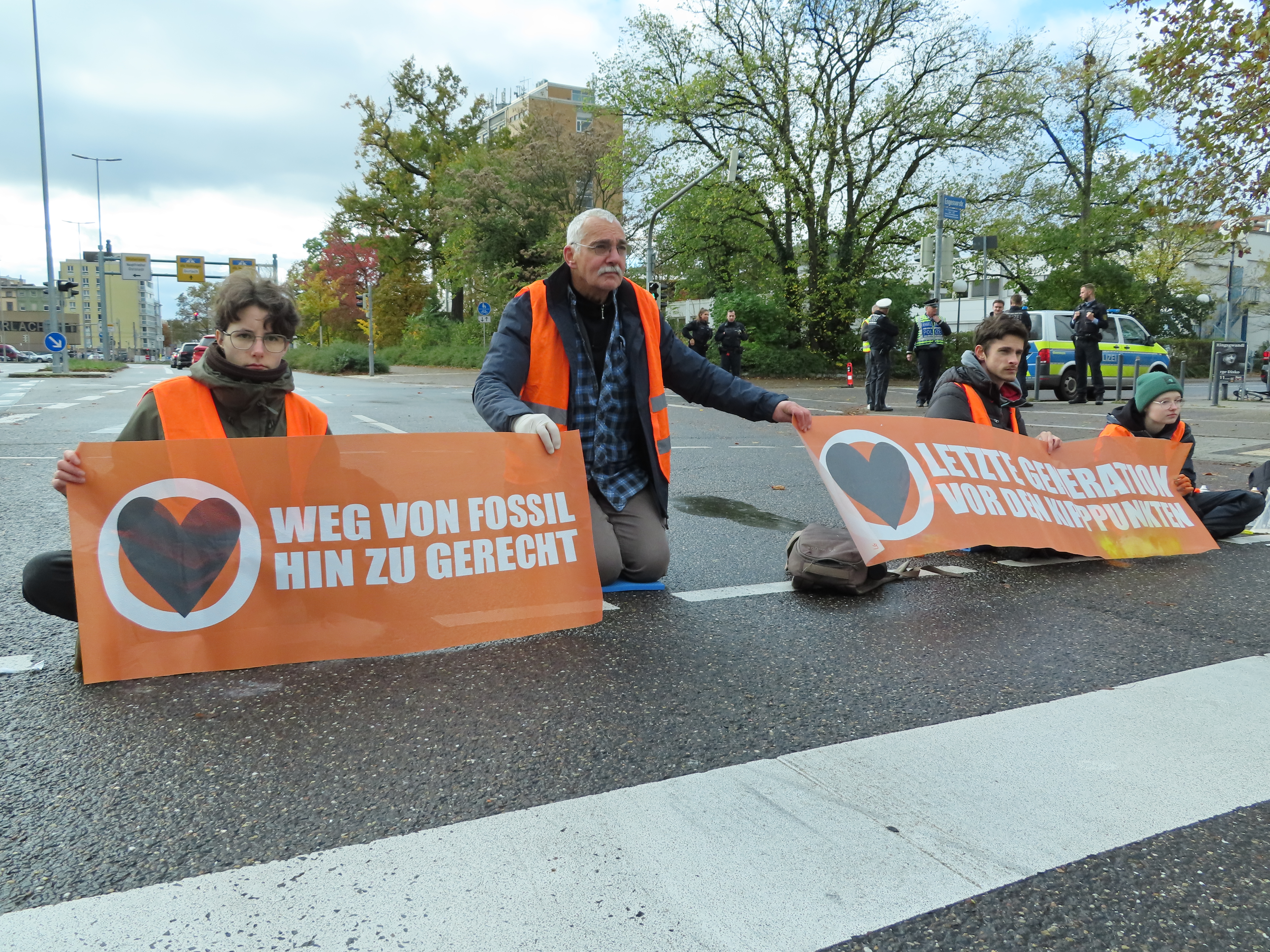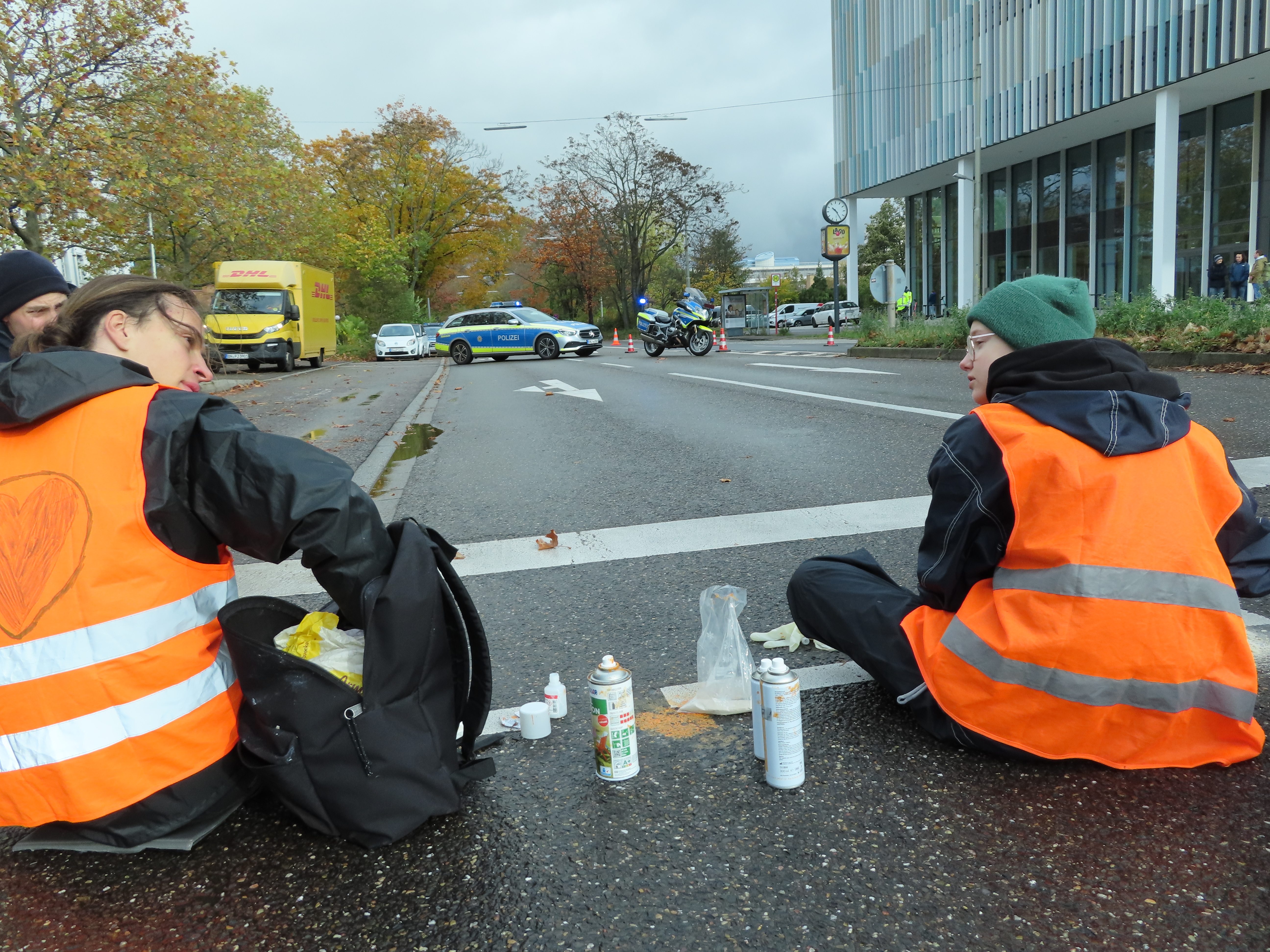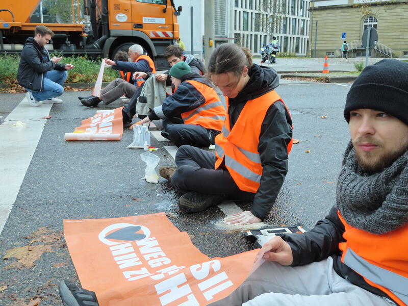Straßenblockade auf dem Karlsruher Adenauerring, Höhe Studentenhaus, am 2023-11-10